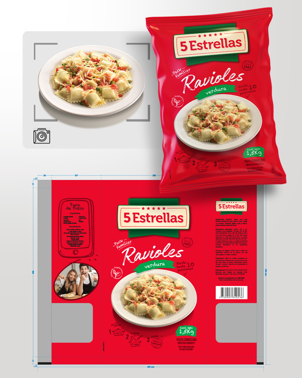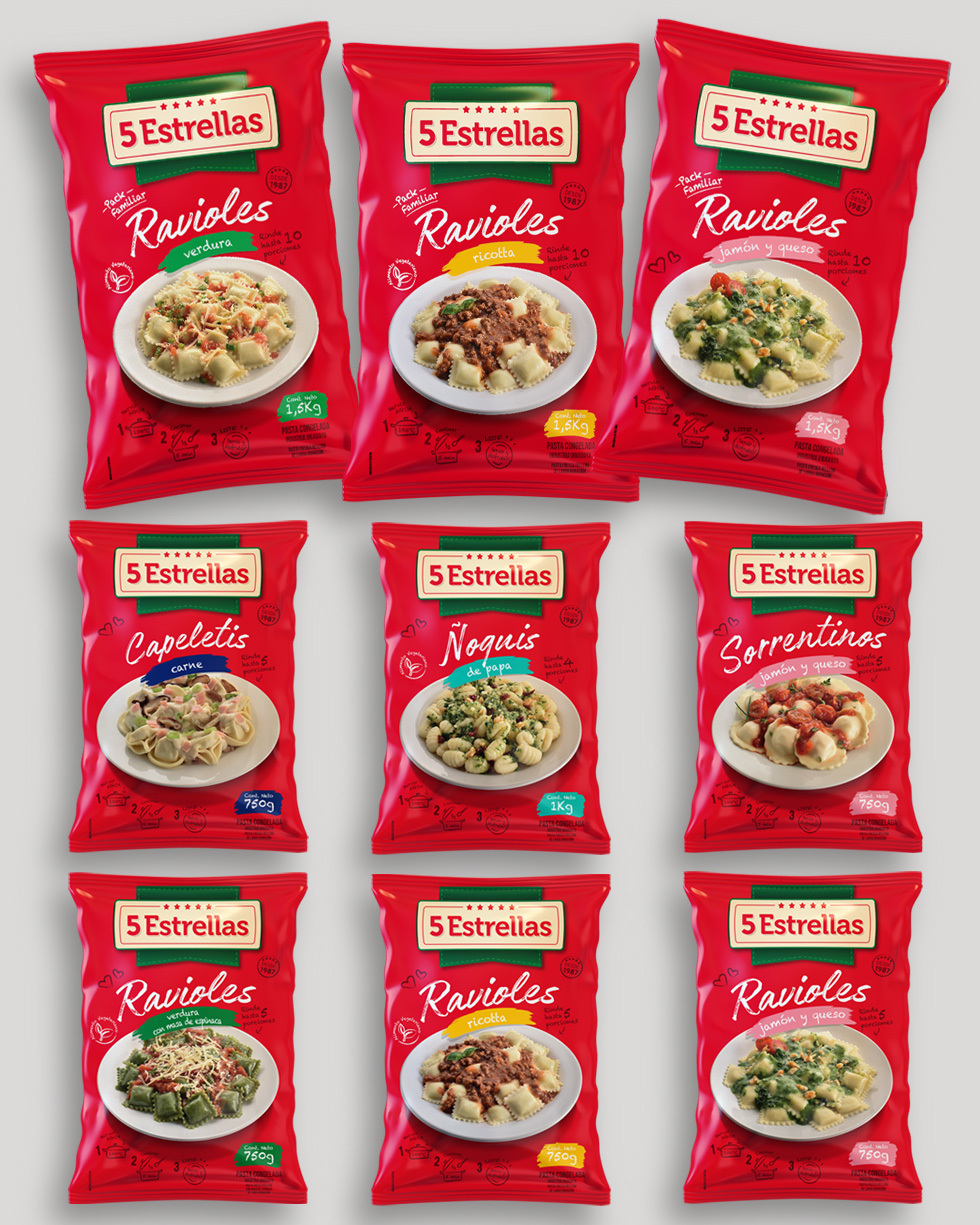 Realizamos el diseño de la línea de pastas congeladas 5 Estrellas. Diversos productos y formatos, con fotos que realizamos específicamente para esta línea.