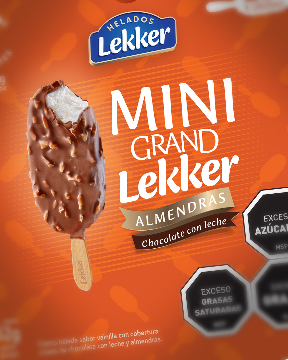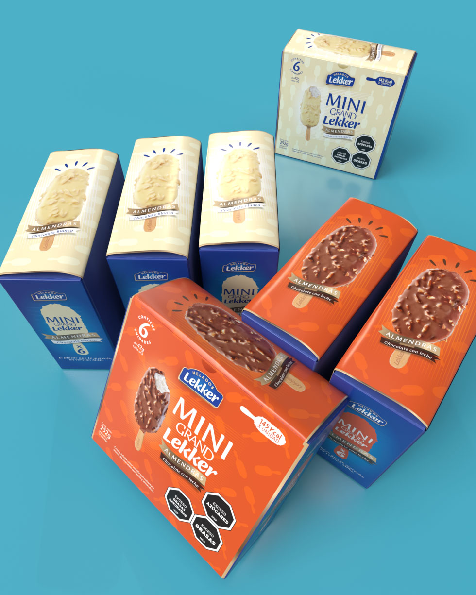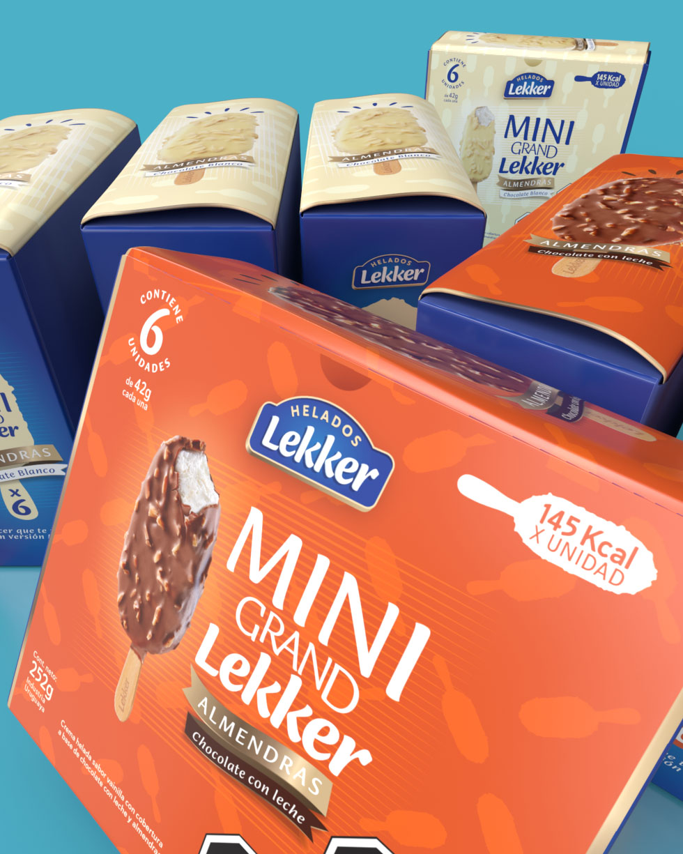 Helados Lekkers continua creciendo. Su helado premium con cobertura es la "Grand Lekker". Para este caso el objetivo es ofrecer un formato de producto en caja de 6 unidades que mantenga la propuesta premium y apetitosa de la Grand Lekker pero en formato mini y de 6 unidades. Un formato ideal para compartir, llevar a reuniones familiares o de amigos. Para este caso creamos el diseño para la "MINI Grand Lekker".