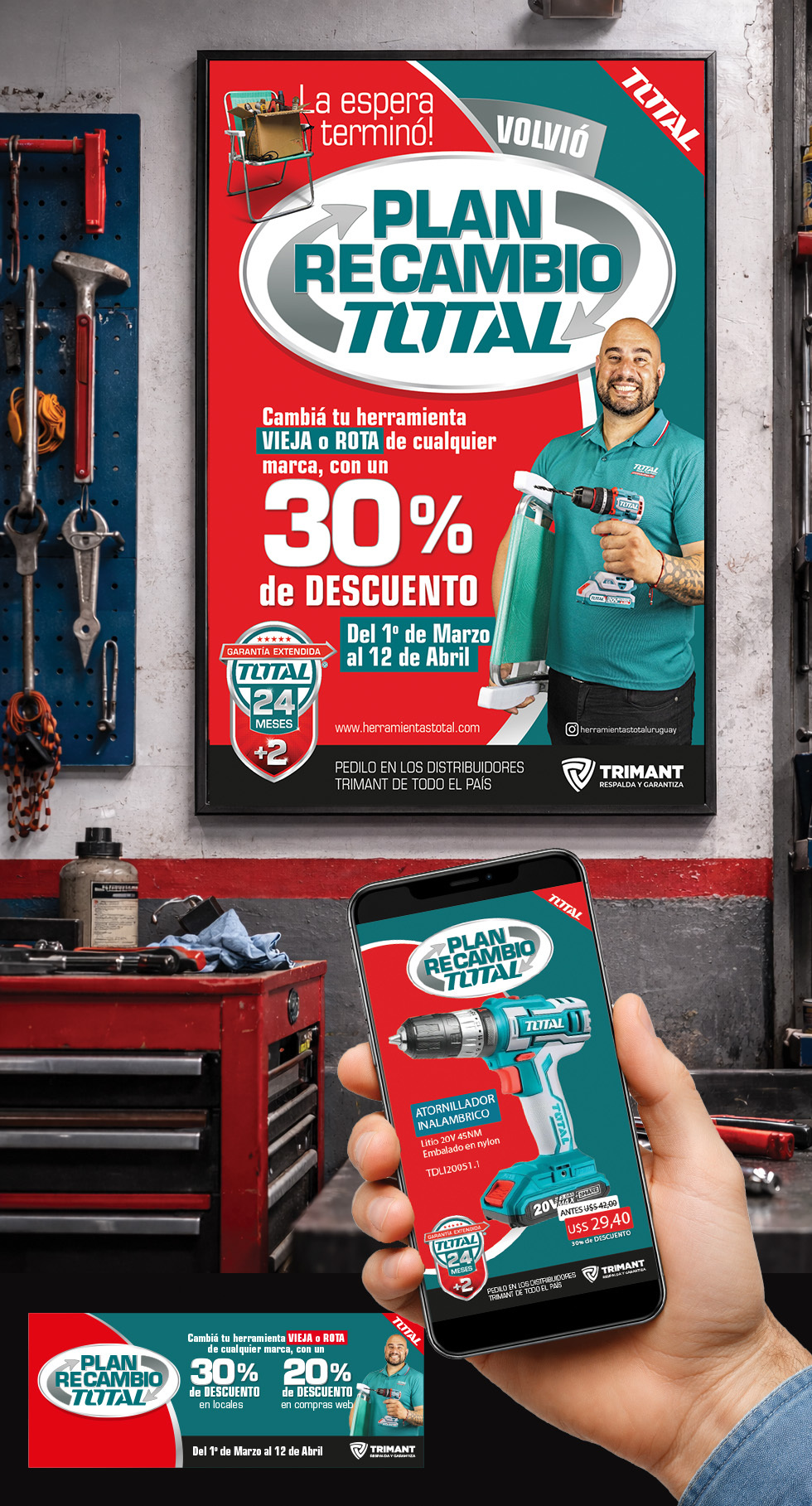 Diseño general de la gráfica de comunicación para la campaña Plan Recambio para Herramientas TOTAL.